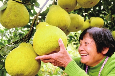 产值3000万左右,今年还新增了养蜂场,衍生了柚子蜂蜜、龙眼蜂蜜等附加产品助农增收。图为果农廖启泽在果园喜摘真龙柚。 杜勇摄