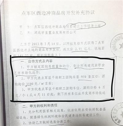 补充协议上明确政府锁定950套团购房,均价3500元/平米。