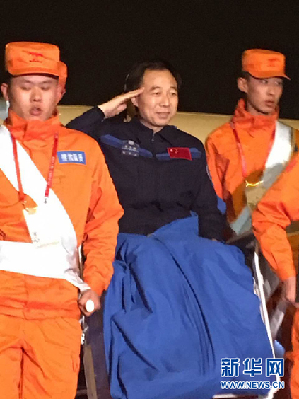 11月18日晚,圆满完成天宫二号与神舟十一号载人飞行任务的航天员景海鹏乘坐专机从内蒙古平安飞抵北京。 新华社发(杨欣 摄)