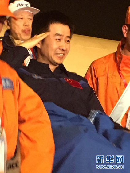 11月18日晚,圆满完成天宫二号与神舟十一号载人飞行任务的航天员陈冬乘坐专机从内蒙古平安飞抵北京。 新华社发(杨欣 摄)