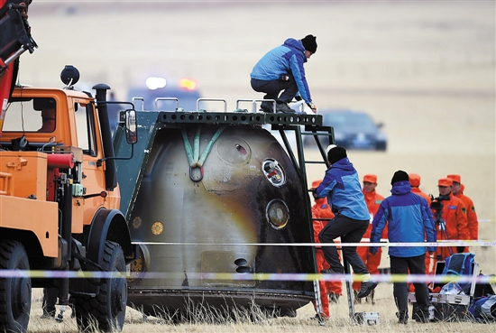 13时59分,返回舱在内蒙古中部预定区域安全着陆。担负搜救回收任务的着陆场站及搜救分队及时发现目标,第一时间到达返回舱着陆现场。返回舱舱门打开后,医监医保人员确认航天员身体健康,并向任务总指挥部报告了情况。