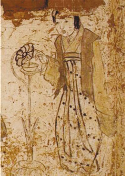 河北宣化下八里四号辽墓壁画中,画有一盏荷叶形的反光灯(见图)。按照图中人的比例推算,灯檠高度应该在1米以上。灯檠下面的灯座是五足圆形,檠柱立于中央,两侧斜出两片叶状饰物。柱顶以托盘承灯盏,盏中立着正在燃烧的炷火。特别值得注意的是,檠柱上端分出一片可以旋转角度的荷叶形弯杈,壁画中旁边站立的女子正用手指拨动荷叶,以调节荷叶的角度,让叶心微下倾,正对炷火。由此可见,我国辽代就已经有荷叶反光灯了。