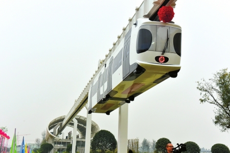 世界首条新能源空铁来了!11月21日下午,在成都双流空港经济技术开发区的中唐空铁产业基地,新能源空铁总设计师、中科院院士翟婉明宣布:世界首条新能源空中铁路(简称空铁)试验线成功投入运行。它把铁轨架在空中,把车厢悬挂在空中,不与人争路,不与车争路,不与植物争生存空间……当日,包括华西都市报记者在内,数百人先后登上了这辆“熊猫号”空铁,抢鲜试乘。戴上大红花,车头车身尽以熊猫元素装扮的空铁,以60公里的时速一路“飞行”……由此打开了改善城市拥堵的想象空间。