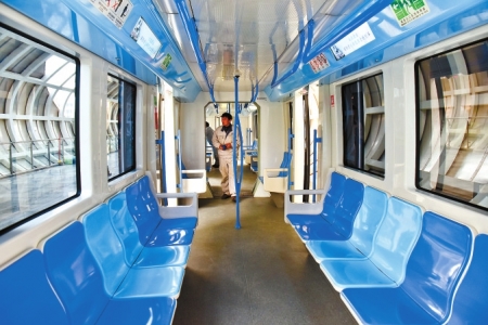 11月21日下午,以熊猫为装饰元素的空铁上路了,华西都市报记者也由此体验了一把“小飞侠”的感觉。这条新能源空铁试验线,为架设于5米之上空中的白色轨道,呈U字形,全长1.4公里。整条试验线由乘客车站、一条正线轨道、一条副线及列车、静调库等相关配套设备构成。可以完全真实地模拟新能源空铁在实际运行中的直线、弯道、爬坡等性能。空铁的前后首座,皆有司机为大家开路。如地铁一般,驾驶舱门与乘客车厢被一道门隔离。车厢内白底,嵌以蓝色座椅和扶手的柱子,看上去有些清爽,左右两侧分列座椅,或因试乘者众,整体感觉有些打挤。据称,一列空铁最高承运量为230人次。站在车厢内,透过玻璃车窗,视线极为开阔,犹如站在二楼眺望远方。该条试验线轨道模拟了城市不同的路况,有弯道,有上坡,线路最大坡度千分之六,最小转弯半径30米。“请大家注意体验,现在进行弯道阶段。”空铁上的“导航员”王凯介绍,这些指标的设定是按照城市路况最复杂的情况下设计的,换句话说,只要这种状况下能取得模拟成功,那么城市其他路况就都能适应。不过,记者感受到在车厢内颠簸还是比较明显。有乘客在车厢内摆放了一瓶矿泉水以测试其平稳性,见水在瓶中不停地跃动着,有乘客打趣道:“这运动的车厢就像给人做按摩一样。”对于车内颠簸的反馈,翟婉明坦率地讲,这可能与焊缝有关,下一步,他们将进一步收集试验参数,改进和优化方案。