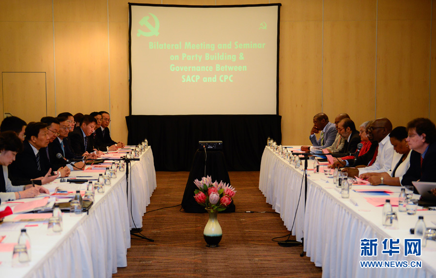 11月22日,中共中央政治局委员、国家副主席李源潮(左三)在南非开普敦会见南非共产党第二副总书记索利·马派拉(右三)。新华社记者翟健岚摄
