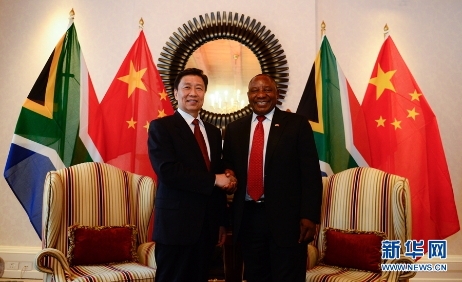 11月22日,在南非开普敦,中国国家副主席李源潮(左)与南非副总统拉马福萨举行会谈。 新华社记者翟健岚摄