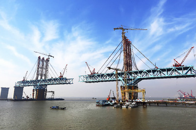 11月24日,沪通长江大桥天生港专用航道桥的施工正加紧推进,中跨对称悬拼钢桁梁预计下月底前合龙。沪通长江大桥天生港专用航道桥主跨336米,通航净空宽度284米,净空高度45米,是目前世界上同类型结构中最大跨度的公铁两用钢拱桥。