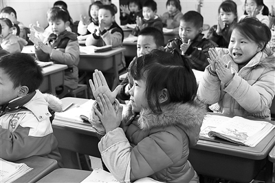 11月24日,江西省新余市长青小学一年级(8)班学生在教师带领下做手指操热身。日前,寒潮来袭,当地气温陡降十五六度,学校在课间加强体育锻炼内容,课上加入身体活动环节,保证孩子们的身体热量和健康。本报记者 鲍效农 摄