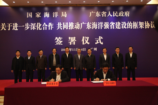 中国海洋报讯 (记者 赵建东)11月24日下午,国家海洋局、广东省人民政府在广州签署《关于进一步深化合作共同推动广东海洋强省建设的框架协议》。中共中央政治局委员、广东省委书记胡春华出席签约仪式,广东省委副书记、省长朱小丹,国家海洋局党组书记、局长王宏在签约仪式上致辞,广东省副省长邓海光、国家海洋局副局长房建孟分别代表广东省政府、国家海洋局签约,广东省委常委、省委秘书长邹铭,副省长蓝佛安等参加签约仪式,广东省政府秘书长李锋主持签约仪式。