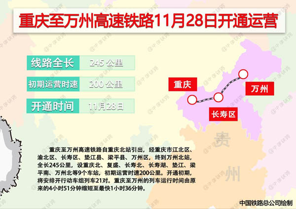 记者从中国铁路总公司获悉,重庆至万州高速铁路将于11月28日开通运营。