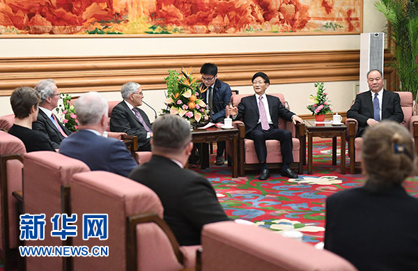 11月25日,中共中央政治局委员、中央政法委书记孟建柱在北京会见中英法治圆桌会议英方代表。 新华社记者谢环驰摄