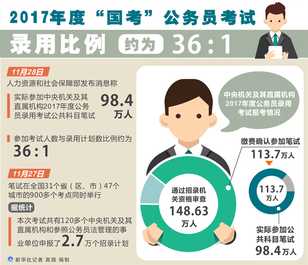 新华社北京11月28日电(记者徐博)人力资源和社会保障部28日发布消息称,98.4万人实际参加了中央机关及其直属机构2017年度公务员录用考试公共科目笔试,参加考试人数与录用计划数比例约为36:1。