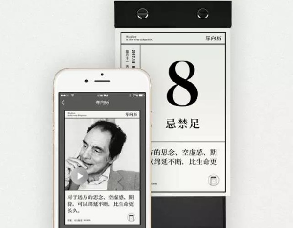 来自于在北京生长十年的独立书店「单向空间」的文艺网红单向历。2017版续了2016版的极简风格,遵循旧黄历朴实的仪式感,每日大师名言加忌宜,让生活的每一天,因文字和词语而不再平庸。