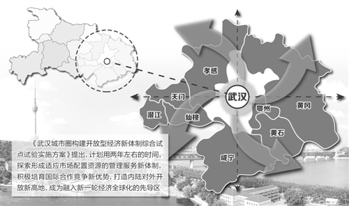 2007年,武汉城市圈被国务院批准为全国资源节约型和环境友好型社会建设综合配套改革试验区。近年来,武汉城市圈各项建设不断加快,以武汉为中心的“放射”状已形成,正在着力构建开放型经济新体制