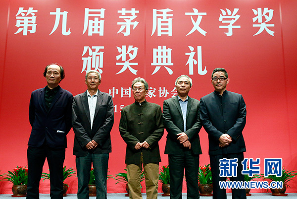 2015年9月29日,5名第9届茅盾文学奖得主、作家金宇澄、李佩甫、王蒙、格非、苏童(从左至右)在北京中国现代文学馆举行的颁奖典礼上登台亮相。新华社记者 潘旭 摄