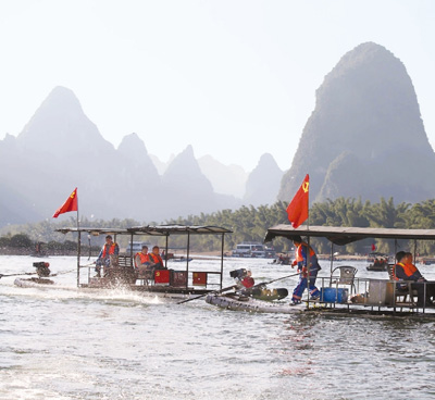 11月27日,刚插上党旗的竹筏在漓江中搭乘游客航行。为加强行业管理和行业自律,广西推动阳朔县漓江竹筏从业者建立协会,并在当天正式成立党总支。党员竹筏从业者将党旗插上竹筏,亮明党员身份,并承诺带头提升服务质量。