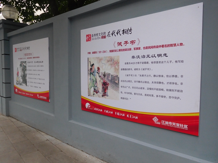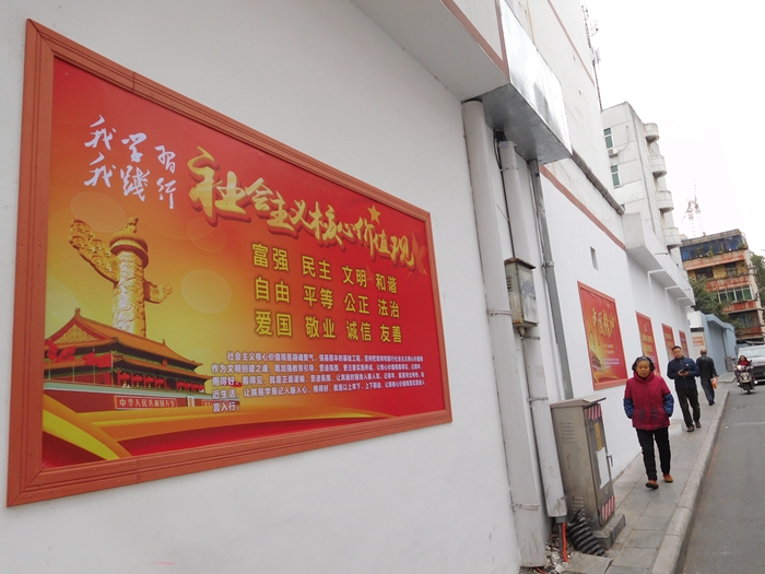 11月23日,在绵阳市江油市中坝镇天宝社区将军巷内,平时匆匆忙忙的路人纷纷放缓脚步驻足瞻观,原来他们是被图文并茂的宣传文化墙所吸引。为拓宽宣传途径,创新宣传方式,贴近百姓生活,营造浓厚氛围,广泛深入开展社会主义核心价值观宣传,绵阳市江油市充分考虑群众的接受方式和程度,结合实际设计制作了一套老百姓喜闻乐见的社会主义核心价值观宣传文化墙,以图文并茂的形式宣传社会主义核心价值观,使社会主义核心价值观文化墙成为广大市民身边潜移默化的“宣讲团”。