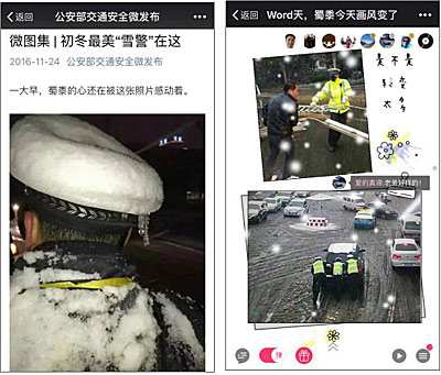 11月24日,公安部官方微信“公安部交通安全微发布”推送“微图集 | 初冬最美‘雪警’在这”,以“图片集+H5”富有冲击力的形式,展示风雪中仍坚守岗位的交警形象,获得广大网友的“点赞”。