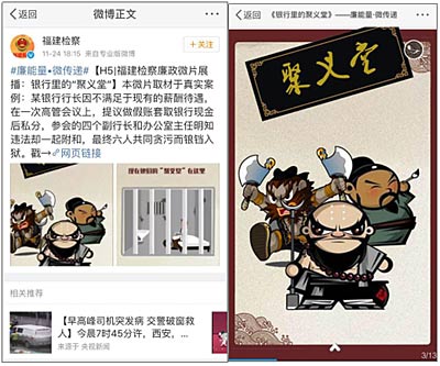 11月24日,福建省人民检察院官方微博“福建检察”推送“H5|福建检察廉政微片展播:银行里的‘聚义堂’”文章,通过卡通漫画的形式生动诠释了真实案例。