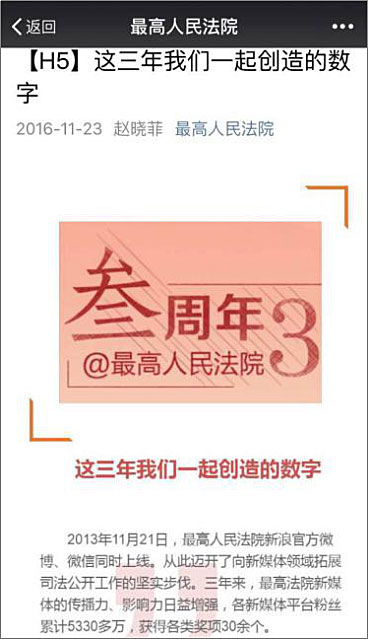 11月23日,最高人民法院官方微信“最高人民法院”发布“【H5】这三年我们一起创造的数字”,通过H5的形式总结了三年来最高人民法院双微平台创造的“数字”。