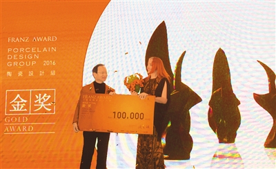 2016法蓝瓷陶瓷设计大赛11月30日在京举办总决赛颁奖典礼。主办方介绍,活动共邀集到包含两岸和日本、德国、美国、意大利等多个国家和地区的新锐设计师,共计1414组队伍同场竞技。经历层层评选,来自以色列的设计师伊登(右)以独特并富有艺术性的香水瓶荣获陶瓷设计组金奖。