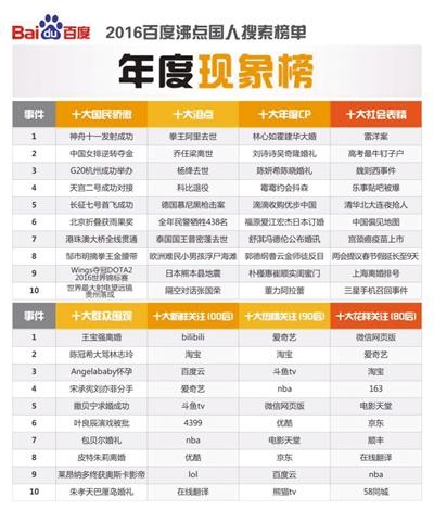 据了解,今年的百度沸点榜单整合了16亿人在今年1月至11月,使用百度风云榜、百度资讯流、百度百科、百度知道、百度音乐、百度手机助手、百度手机输入法等多个产品的数据,汇聚了2016年国人搜索热点。