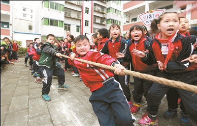 近日,湖北省竹山县宝丰镇施洋小学的学生开展“阳光大课间”拔河比赛。拔河比赛充分展示了团队合作精神,丰富了学生课余生活,激励学生走向操场、走进大自然、走到阳光下,积极参加体育锻炼。朱本双 陈小平 摄