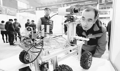 12月4日,第二届全国大学生智能农业装备创新大赛在江苏大学举行,来自中国农业大学、吉林大学、江苏大学等全国39所高校的500余名大学生围绕“智能农装 创新未来”主题,展示了209件智能农业装备创新作品。据了解,本届大赛上有多项作品是由多家国内知名农机企业在赛前根据企业需求和研发计划面向大学生出题征集的,这些作品成功解决了企业难题。图为观众在认真观察参展设备。