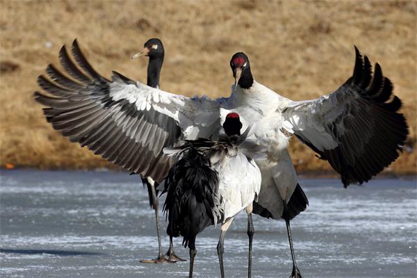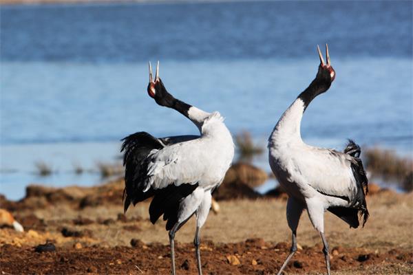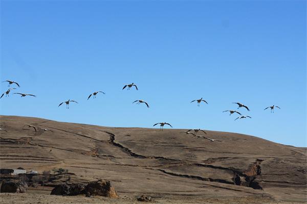 全世界有8000多只黑颈鹤,到昭通大山包越冬的就有1300多只,大山包也是国内已知的最大黑颈鹤种群所在地。冬日的早晨,水草丰盛,空气清新,一群黑颈鹤掀动着黑白分明的翅膀,灵动地惊起了这充塞天地之间近乎定格的宁静,充满生机的一天又开始了。
