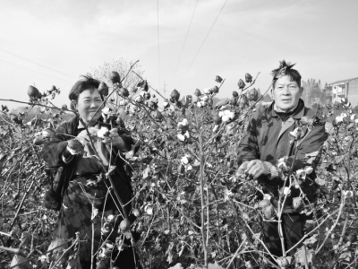 湖北省云梦县胡金店镇盛砦村73岁的科技植棉示范户盛信典(右),今年种了5亩国审华杂棉H318新棉种。在经历罕见的旱涝灾害后,由于抗灾得力,每亩已收籽棉550斤,地里棉株上还有很多秋桃,每亩还可收籽棉100多斤,亩收入过2000元,图为老两口11月29日喜采优质棉。余宏章摄