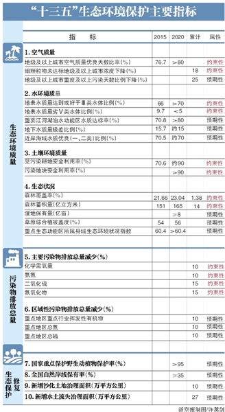 据介绍,《规划》提出12项约束性指标,包括地级及以上城市空气质量优良天数、细颗粒物未达标地级及以上城市浓度、地表水质量达到或好于Ⅲ类水体比例等。