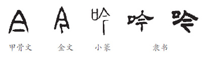我们首先看“吟”字。“吟”的本字为“今”,其甲骨文为倒写的“口”,下面一横为指事符号;金文则将横画写成折笔;小篆承续金文字形,并加“口”另造“吟”字;隶书是经过隶变后的今文字,除我们常见的写法外,还可以沿用小篆字形,这是用今文字书写古文字。下图为“吟”的字形演变——