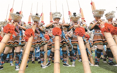 近日,在广西柳州融水苗族自治县民族中学校庆仪式上,学生在吹奏芦笙地筒。近年来,该校把民族文化融入到学生素质教育中,建立了一支由400多名学生组成的芦笙队,学生们在学习民族文化中提升了整体素质。龙涛 摄