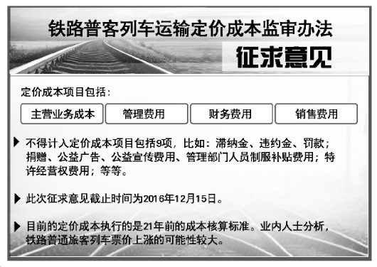 此次公开征求意见的时间为2016年12月1日至2016年12月15日。业内人士分析,目前的铁路普通旅客列车运输定价成本执行的是21年前的成本核算标准。即1995年,为了缓解铁路客运价格偏低、企业严重亏损的问题,经国务院批准,旅客票价基价率从每人每公里0.03861调整到0.05861,同时适当调整了不同席别的比价关系。而随着社会的发展和变化,目前的铁路旅客票价形成机制,已经不适应市场经济和运输市场竞争的基本需要。