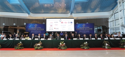 碧桂园集团董事局主席杨国强、总裁莫斌等一众高管以及SASAKI、德国艾巴维、英国雷丁大学等签约单位代表集体亮相。36家机构总产值超过5万亿元,总市值超过6万亿元,其中包括华为、思科、埃森哲、中建海外、美的、德国博世、中建钢构、德意志银行亚太区总行、中国银行马来西亚分行等9家财富世界500强企业或其下属企业。