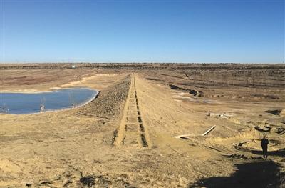 鄂尔多斯遗鸥国家级自然保护区上游的一个淤地坝,可以看见上游蓄积了一片水域,下游则几乎干涸,专家认为这是湿地消失的一大原因。