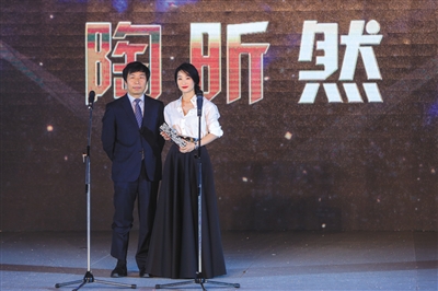 新京报社副总编辑王爱军为陶昕然颁奖。