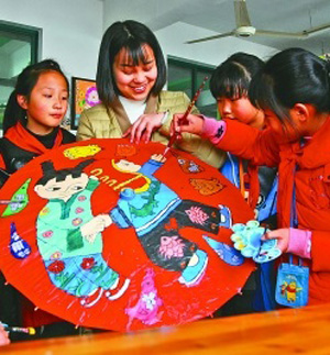 12月8日,浙江省建德市航头中心小学雨巷纸伞画社的美术老师徐迈熙正在指导学生将农村春耕、秋收等场景,以农民画的形式呈现在传统油纸伞上。