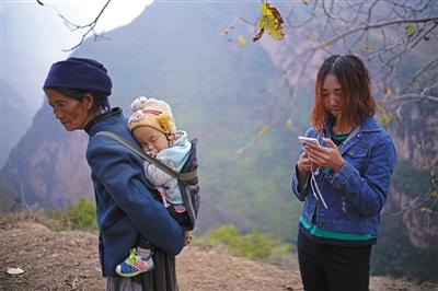 11月14日,瓦屋村靠悬崖边处,打工回家的芳芳用手机聊天。这是村里唯一有信号的地方。