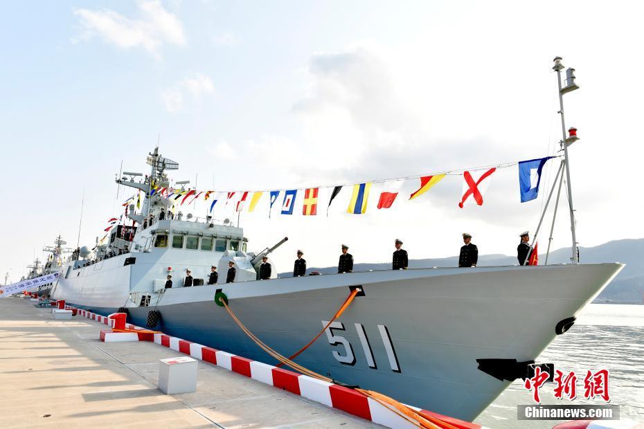 12月12日,中国自行设计制造的某新型导弹护卫舰保定舰、菏泽舰入列命名授旗仪式在江苏连云港某军港举行,标志着两舰正式加入人民海军战斗序列。保定舰、菏泽舰属同一型舰,舷号分别为511、512,满载排水量1300余吨。两舰装备了多套中国自主研发的新型武器装备,信息化程度高,隐身性能好,可单独或者协同其他兵力攻击敌水面舰艇、潜艇,具有较强的防空、反潜和对海作战能力。 中新社发 徐巍 摄