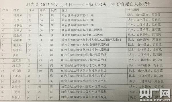 然而,有当地村民匿名给中国之声寄来一份死亡人员名单。据这份名单显示,共有38人在岫岩“8.4洪灾”中遇难,遇难者的姓名、年龄、家庭住址等信息均被详细地统计在内。