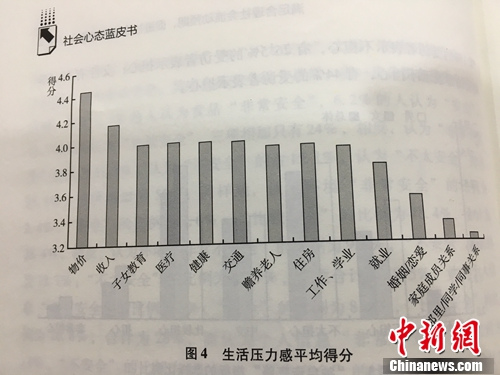 物价、自己或家庭收入排在生活压力的前两位。图片来源:《社会心态蓝皮书:中国社会心态研究报告(2016)》。汤琪 摄