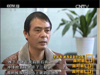 后来,海盗要把船迁到别的地方抛锚,李波海表示机舱下面没有多少油,船跑不了多远,海盗表示没有油没关系。于是,李波海把锚起上来就开始航行。船航行到差不多一个多小时时,机舱下面真的没有油了,海盗把李波海直接从驾驶台上面推下去。三个海盗,推下去就在李波海的肩膀后面,用冲锋枪连开了三枪,李波海吓得马上就趴在地上。