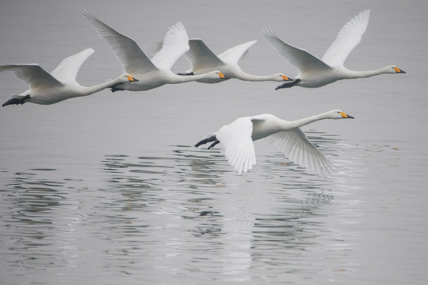 进入冬季,越来越多的白天鹅南迁来到江苏省盱眙县猫耳湖湿地栖息越冬。(江苏省盱眙县纪委 张燕)