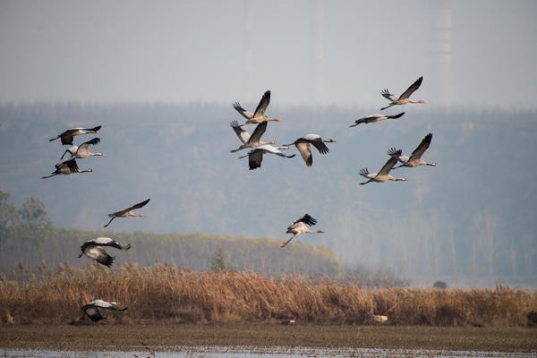 秋冬时节,河南省灵宝市大王镇北营黄河滩吸引了众多灰鹤安营扎寨。(河南省灵宝市水利局监察室 郭作民)