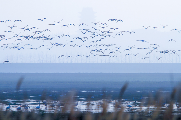 鄱阳湖国家湿地公园,每年冬天,大量白鹤与天鹅选择到这里过冬。(江西省鄱阳县纪委)