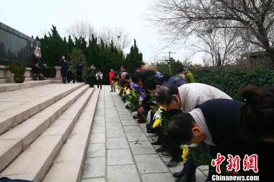 福建船政名杰后裔及北洋海军将士后裔在北洋海军将士名录墙前献花。 杨强 摄