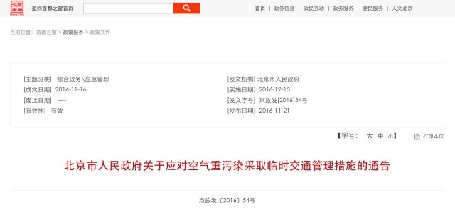 八、本通告自2016年12月15日起实施,《北京市人民政府关于应对空气重污染采取临时交通管理措施的通告》(京政发〔2015〕34号)同时废止。