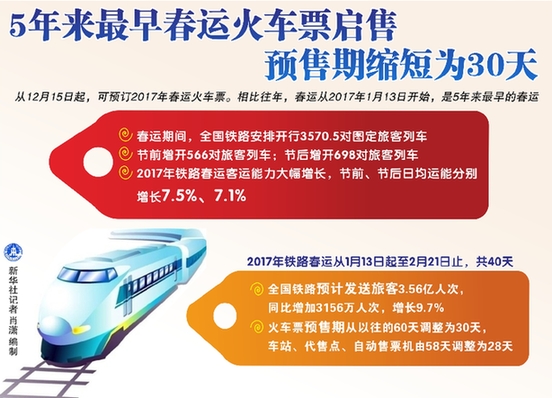 5年来最早春运火车票启售 预售期缩短为30天 新华社记者 肖潇 编制