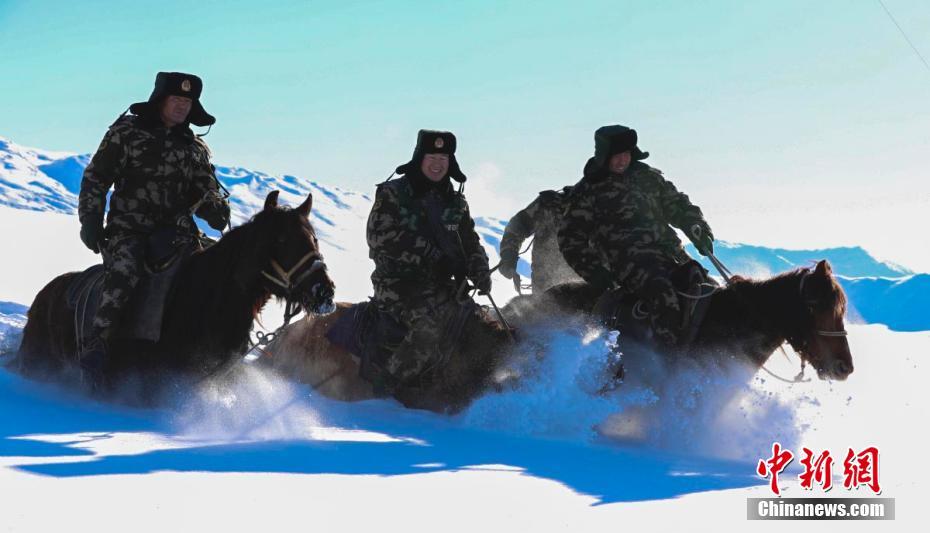 12月14日,新疆富蕴县公安边防大队吐尔洪边防派出所协警员骑马在齐腰深的雪地中进行越野训练。当日,该辖区协警员在民警的指导下,冒着零下20摄氏度的严寒,开展 “大练兵”活动,提升协警综合业务素养,强化体能和处警能力。丁宁 摄